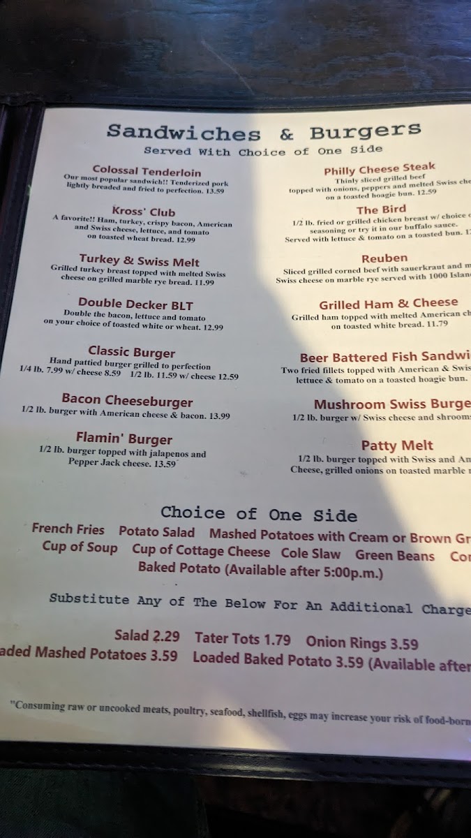 Patrons rave about the generous portion sizes, often leaving with leftovers, and the friendly service further enhances the dining experience. Don’t forget to try their pies—a beloved treat that rounds out the meal perfectly! Whether you're new to the area or a local, Kross Lounge is a must-visit for anyone craving delicious, homemade food.